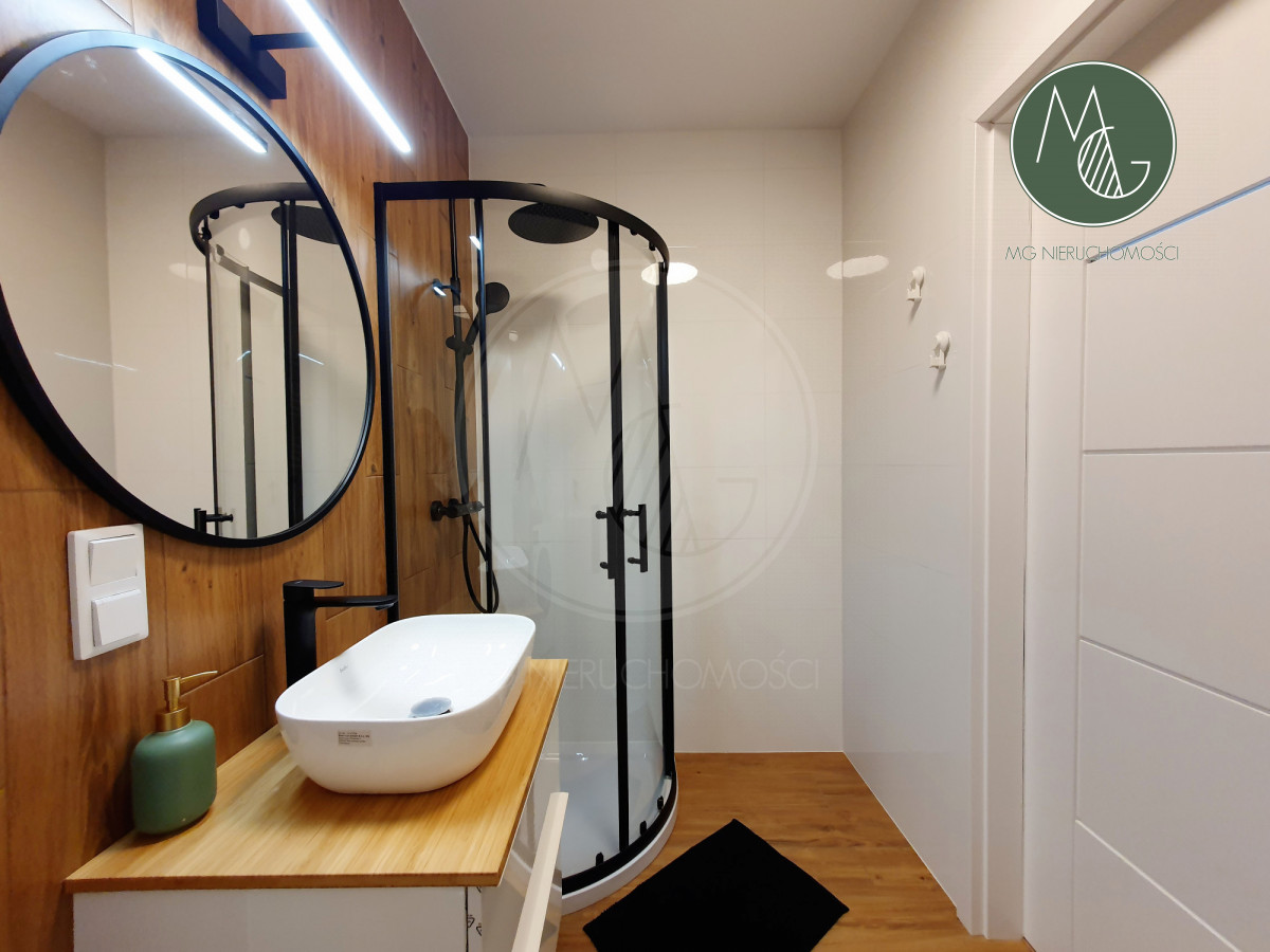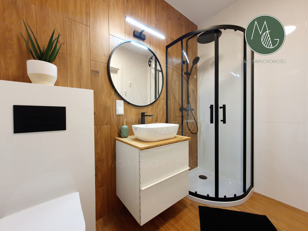 - łazienka z kabiną prysznicową, pralką i szafkami